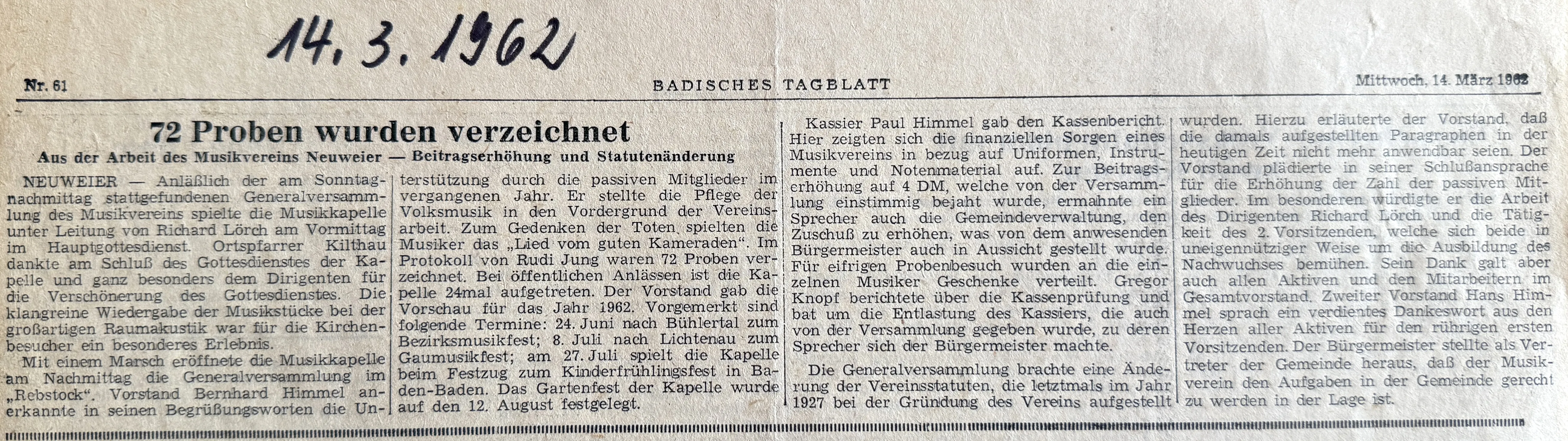 Aus der Arbeit des Musikvereins Neuweier - Beitragserhöhung und Statutenänderung