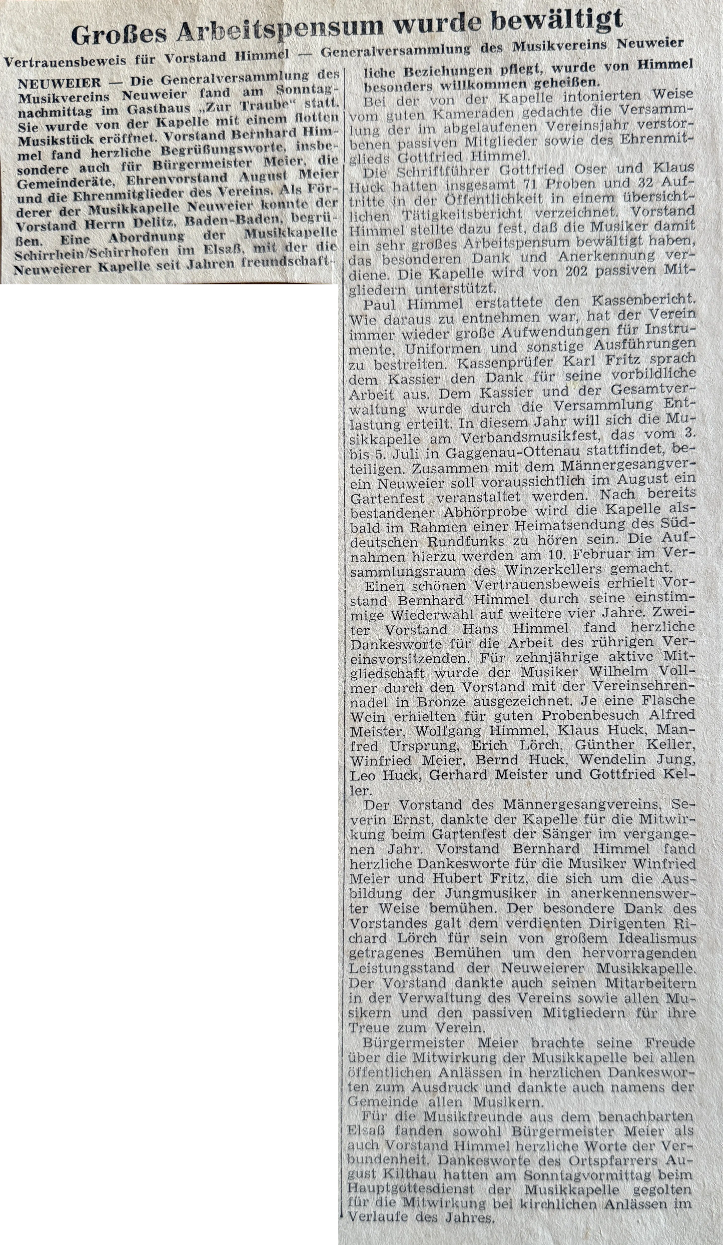 Von jeher brachten die Veranstaltungen der hiesigen Musique "Harmonie" zahlreiche Freunde und Musikanhänger auf die Beine. Diejenigen vom letzten Sonntag hat alle bisherigen weit übertroffen. Der Grund hierfür durfte wohl die Verpflichtung des Musikvereins Neuweier (Baden) sein, der hier auf die angenehmste Art überraschte.