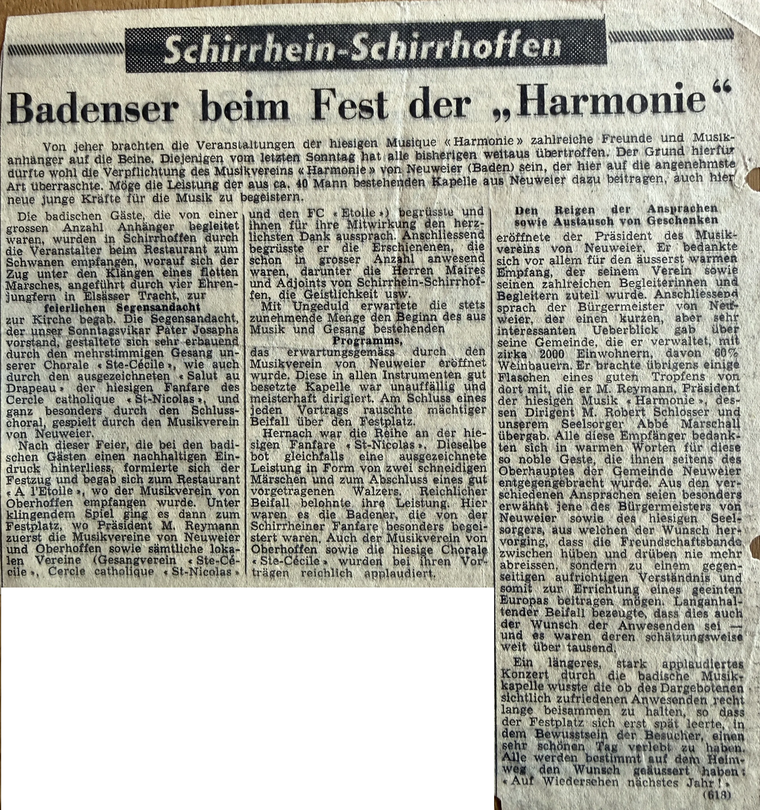 Von jeher brachten die Veranstaltungen der hiesigen Musique "Harmonie" zahlreiche Freunde und Musikanhänger auf die Beine. Diejenigen vom letzten Sonntag hat alle bisherigen weit übertroffen. Der Grund hierfür durfte wohl die Verpflichtung des Musikvereins Neuweier (Baden) sein, der hier auf die angenehmste Art überraschte.